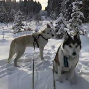 One reactive husky cross rescued from Fort MacPherson, NWT, and two slightly less reactive humans, Gabriella and Graham.