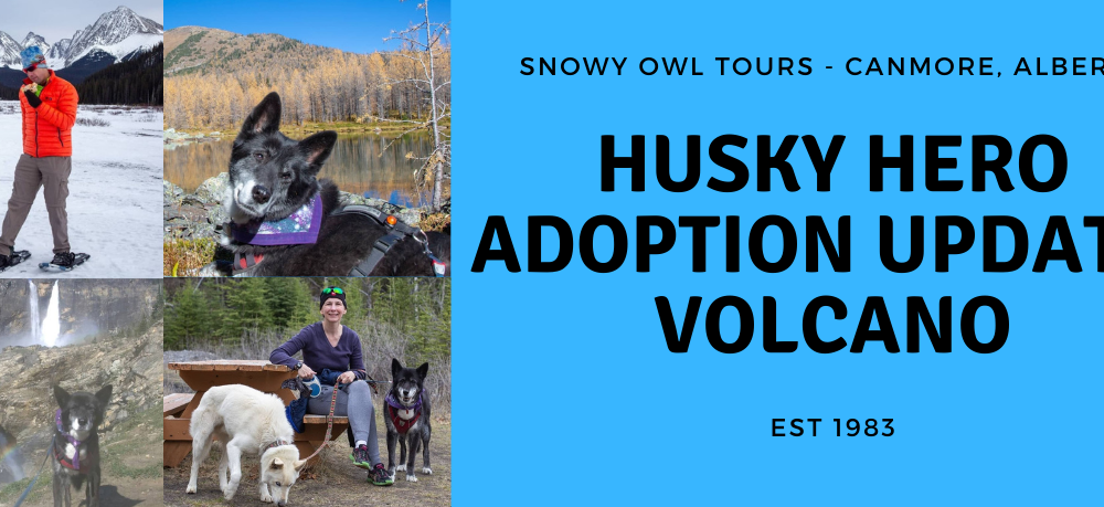 In this edition of the Snowy Owl Sled Dog Tours ‘Adoption Update’ we catch up with husky hero, Volcano! We are grateful that Volcano’s owner, Ian, volunteers his time taking our husky heroes who are available for adoption out on adventures with Volcano! Follow along on all of their outings in the Canmore and Banff area on their Instagram account: @senioradventurepups