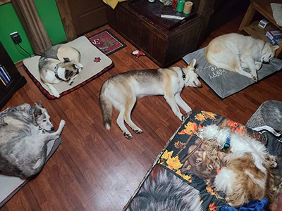 Our family……when we adopted Savannah and Mikey it was just me and my twin girls and our rescue husky Rockie…oh and 7 cats. Now my partner and her two children live with us, we adopted another rescue husky in 2020 and my partner’s dog (a cockalier) lives here too! We also have chickens and goats, and 2 barn cats and 2 acres of land for husky fun!