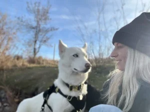 Alysson adopted Ash from Snowy Owl Dog Tours in March of 2023 after meeting her for the first time earlier in the fall. The pair live in Calgary, and Alysson told us that her favourite thing about Ash is her temperament and personality. “Ash is calm, cuddly, curious, gentle, well-socialized (adults, children, dogs), beautiful, loyal, loving, and intelligent. She’s my new roommate and best buddy!”