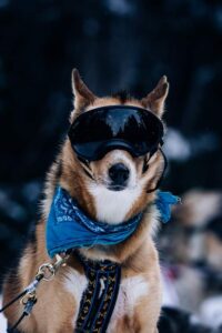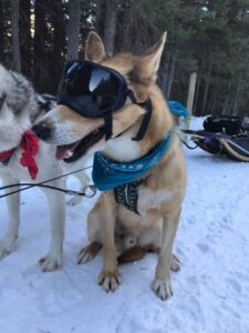 Meet Bear, one of Snowy Owl’s husky heroes. Bear wears Doggles. In this photo, he’s patiently awaiting the call of “HIKE!” from the musher on the sled behind, at which point they’ll hit the trail.
