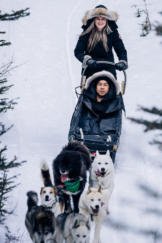 Imagine being able to stand on runners at the back of your sled and command your own dog team through the beautiful Canadian Rockies! To yell “Hike” and watch the enthusiasm of your pack of husky heroes as they take off! With our signature self-driven sled, you experience being the musher while your family and/or friends sit in the sled and enjoy the ride. Do not fret though, halfway through your tour you get to swap spots/seats so you all get an opportunity to experience the joy of commanding your own team of husky heroes!